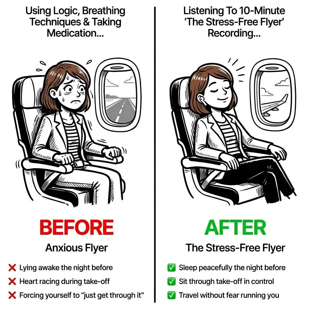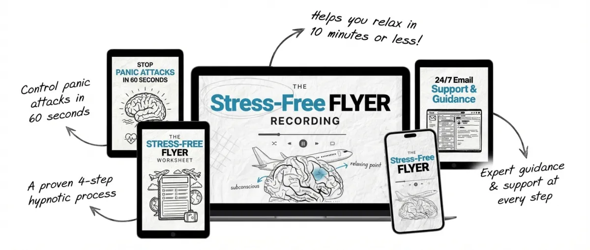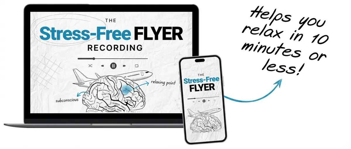 That solution is our hypnotic recording called “The Stress-Free Flyer” which allows you to become relaxed and in control in 10 minutes or less.